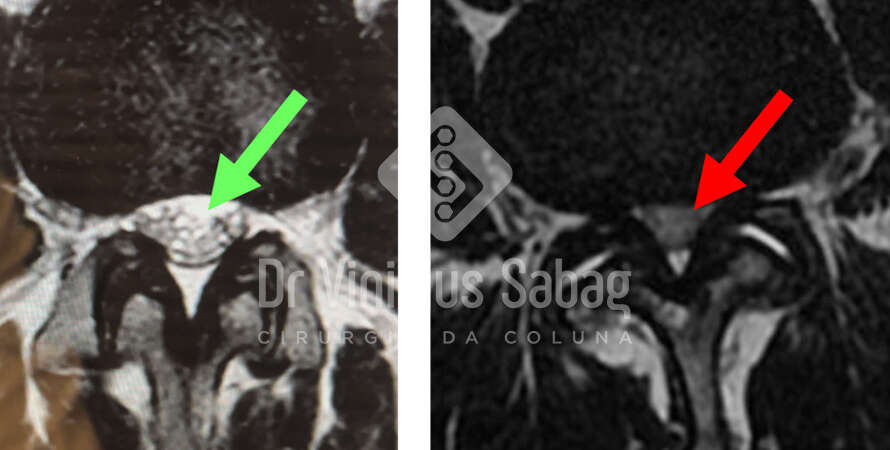 Ressonância magnética evidenciando hérnia discal L5-S1 à direita com compressão neurológica.