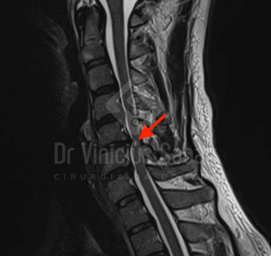 Ressonância magnética da coluna cervical evidenciando compressão medular grave. A área destacada em branco (seta) indica mielopatia cervical, sinal de sofrimento da medula espinhal.