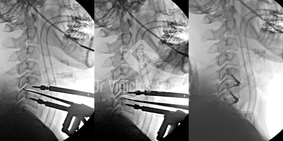 Raio X intraoperatório evidenciando a descompressão da medula e fixação das vértebras cervicais.