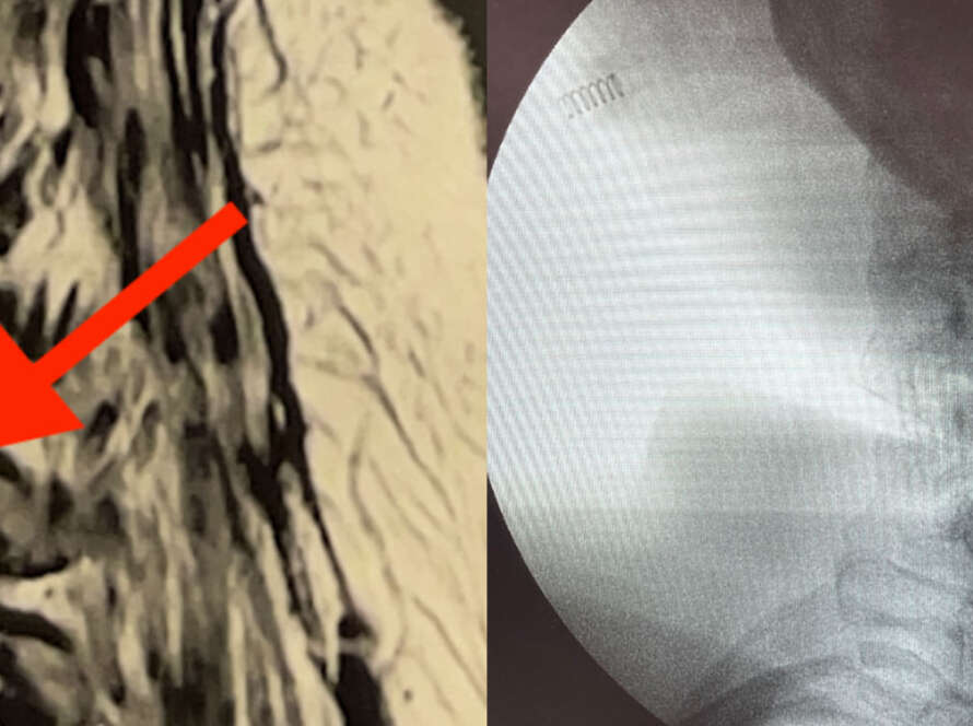 Exemplo de compressão neurológica causada por hérnia de disco extrusa.