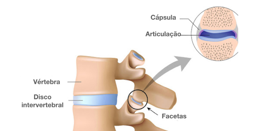 A coluna vertebral é formada por vértebras empilhadas, discos e por pequenas articulações posteriores chamadas articulações facetárias.