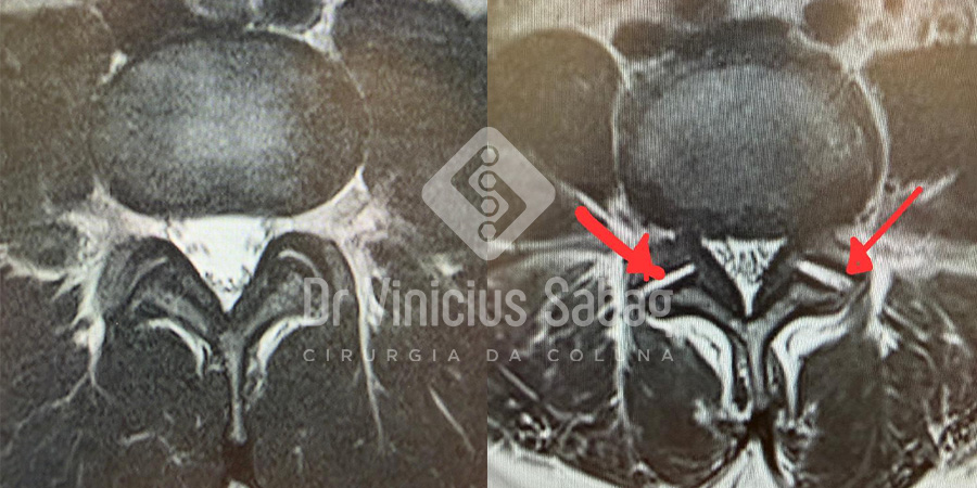 Ressonância magnética evidenciando a esquerda facetas articulares normais e a direita degeneradas (setas vermelhas).