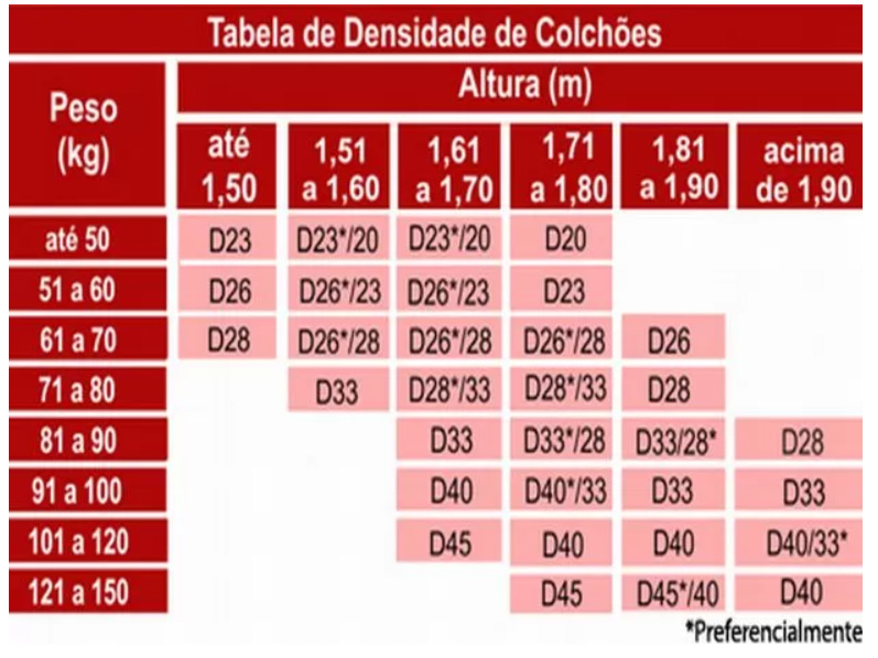 A densidade (D) é um dos fatores mais importantes. Um colchão de densidade incorreta pode causar desalinhamento postural.