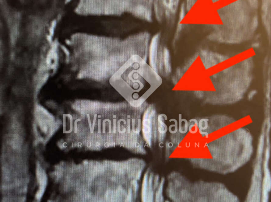 Ocorre quando uma vértebra escorrega sobre a outra, podendo causar compressão nervosa e instabilidade na coluna. A dor pode irradiar para as pernas, como na hérnia, mas é necessário um olhar específico para detectar essa alteração no alinhamento vertebral.